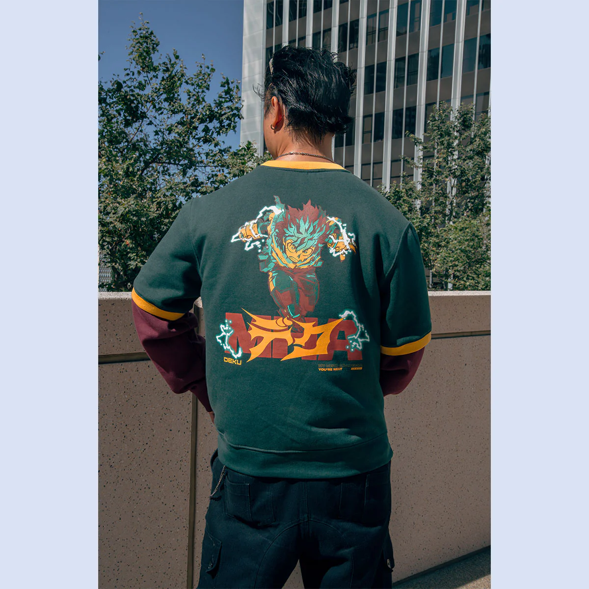 With Deku’s silhouette on the back and a sleek embroidered front logo, this layered look imbues each wearer a style quirk.